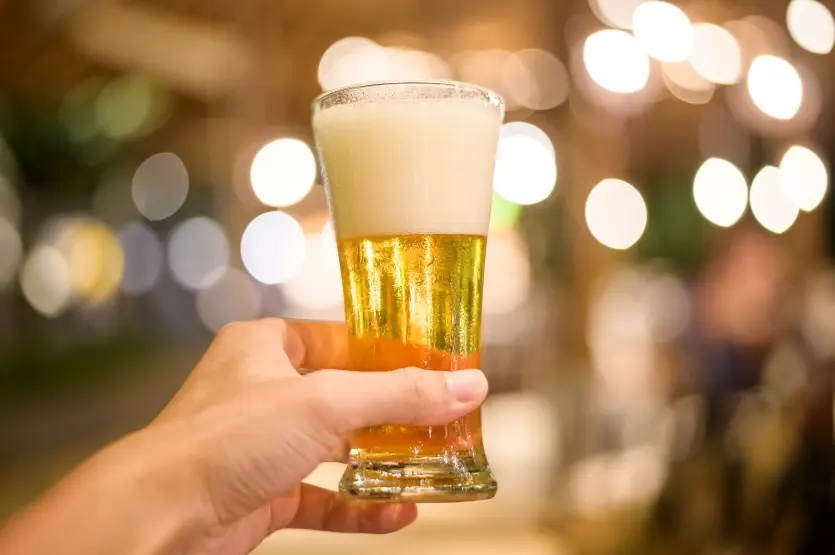 Close up of hand holding a glass of beer to celebrate at restaurant.