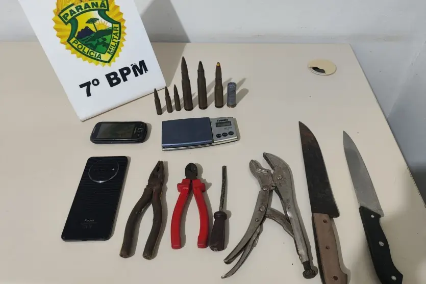 A equipe policial, ciente de um boletim de ocorrência registrado no dia 9 de outubro, que relatava o furto de um celular, deu voz de abordagem ao suspeito. Durante a busca pessoal, foi encontrado um aparelho da marca Xiaomi Redmi A3, que correspondia à descrição do celular furtado. Além do telefone, foram localizadas dentro da mochila do indivíduo sete munições de calibres diversos, incluindo 7.62, .30, .50 e uma de calibre 12, além de duas facas e três alicates.
