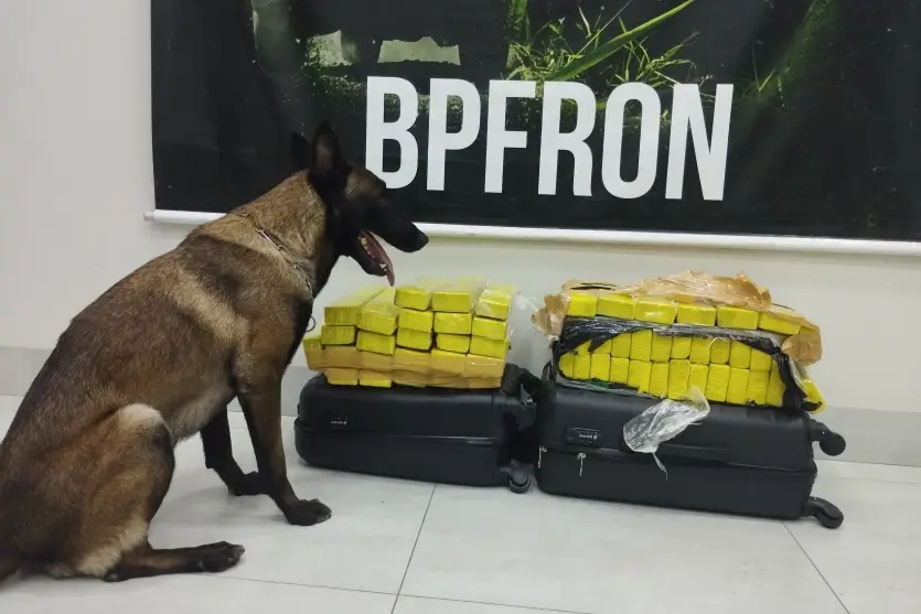O cão de faro Nero, da 4ª Cia do Batalhão de Polícia de Fronteira (BPFron), auxiliou na apreensão de quase 40 quilos de maconha avaliadas em R$ 118 mil na Rodoviária de Umuarama, na noite desta terça-feira (22). A droga estava em posse de um casal, ambos de 32 anos, que receberiam R$ 8 mil pelo transporte do material até a cidade de São Paulo.