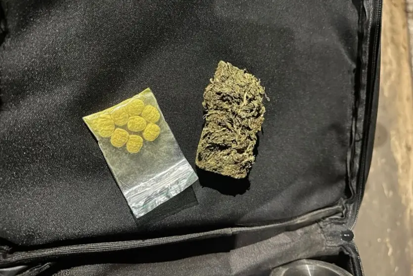 Ao se aproximar do carro, a equipe abordou e identificou os ocupantes, uma mulher de 27 anos e um homem de 26. Dentro do veículo os militares encontraram uma lata contendo 42 gramas de substância análoga à maconha. Próximo ao automóvel, do lado de fora, também foi encontrado um pacote com oito comprimidos de ecstasy, que, segundo a PM, teriam caído quando um dos abordados desceu do carro.