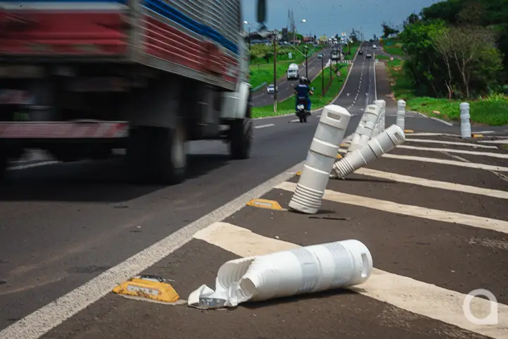 Menos de uma semana após a instalação de centenas de balizadores no trecho urbano da PR-323, em Umuarama, grande parte deles já foi arrancada ou destruída. Os equipamentos, colocados entre a Loja Havan e o Parque de Exposições, servem para sinalizar a via, com o objetivo de orientar e dar segurança aos condutores.