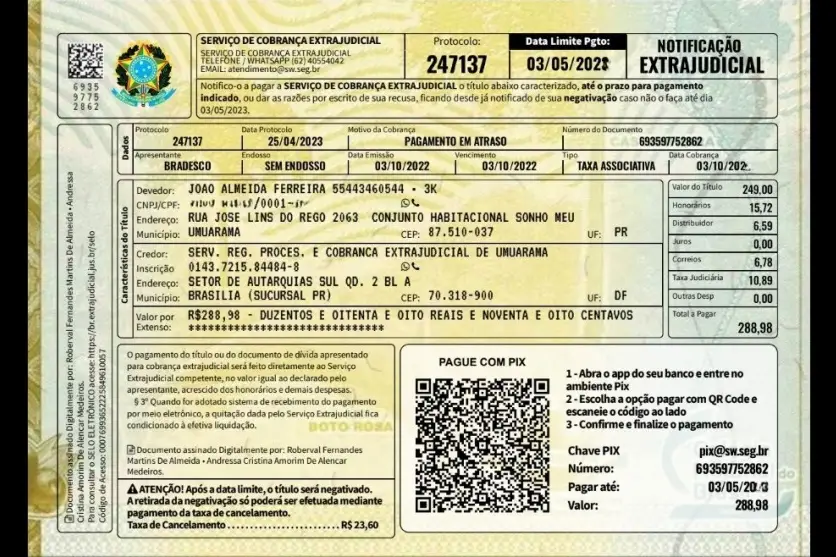 A Notificação Extrajudicial diz estar assinada digitalmente por duas pessoas, que não existem: Roberval Fernandes Martins de Almeida Andressa Cristina Amorim de Alencar Medeiros. “Só no Reclame Aqui existem vários depoimentos a respeito desse mesmo caso, que já foi realizado em diversos estados brasileiros. Para se ter uma ideia, o número apresentado para pagamento por pix cai em uma conta no banco Bradesco de Goiânia (GO) e algumas vezes no Rio de Janeiro (RJ). É preciso prestar muita atenção”, indica.