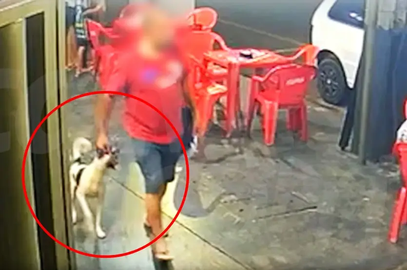 A cena aconteceu na Casa de Carnes Oliveira, na Avenida João Marangoni. Uma câmera mostra que o cão estava atento aos clientes do estabelecimento. No instante em que o homem passa, o cachorro abocanha o churrasquinho da mão do cliente.