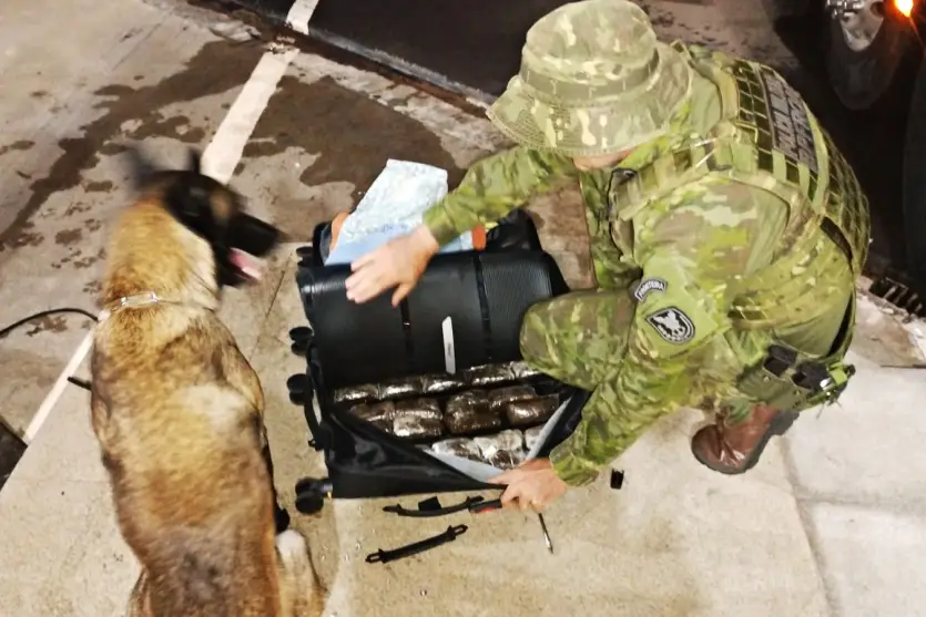 Através de patrulhamento, os agentes abordaram um ônibus que fazia a linha Guaíra x São Paulo, sendo empregado o cão de faro Nero, que indicou positivamente a presença de drogas em uma mala que estava no compartimento de bagagem.