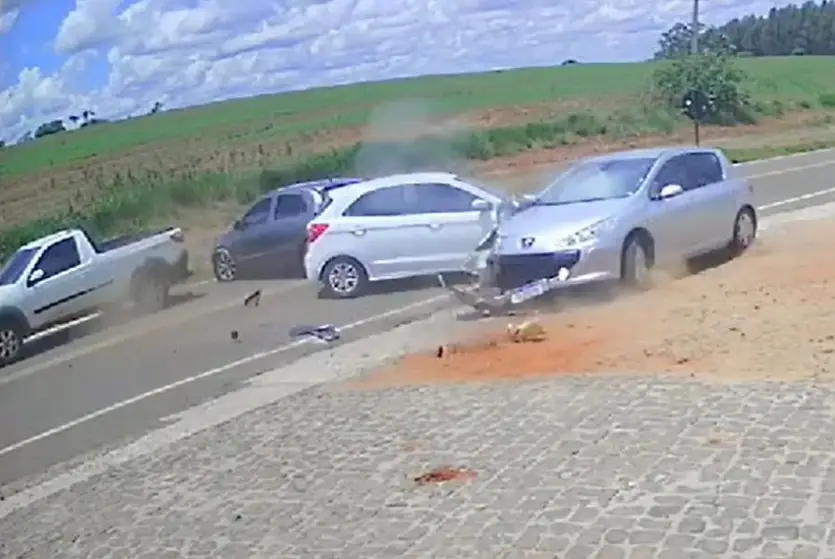 Uma câmera de monitoramento flagrou um acidente que envolveu quatro veículos na rodovia PR-567, no distrito de São Lourenço, em Cianorte. A situação aconteceu por volta das 14h do último domingo (17) e, por sorte, apenas uma pessoa ficou ferida.