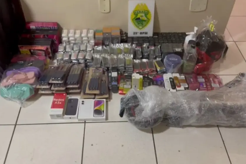 Entre os produtos apreendidos estavam 19 essências e 47 baterias para cigarro eletrônico, 195 cigarros eletrônicos, um iPhone 14 e dois iPhones 16. Já no restante do veículo os policiais localizaram um smartphone Xiaomi Redmi A3X, cinco malas de diferentes tamanhos, um robô aspirador, um notebook HP, uma caixa de som portátil, produtos de maquiagem, perfumes, cremes, um patinete elétrico, jogos de facas e garfos Tramontina, sandálias Havaianas, bebidas, e outros itens.
