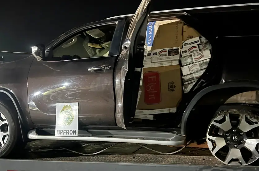Devido à alta velocidade, o motorista da caminhonete perdeu o controle da direção, abandonou o veículo e fugiu. Na sequência, os policiais foram até a SW4 abandonada e viram que seu interior estava carregado com cigarros contrabandeados. A carga somou 60 caixas do produto.