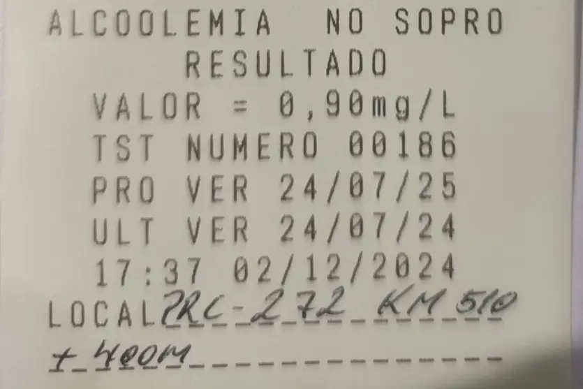 De acordo com a PRv, o condutor apresentava sinais claros de embriaguez, como odor etílico. Submetido ao teste do bafômetro, foi constatado o valor de 0,82 mg/l de álcool no sangue, configurando crime de trânsito.