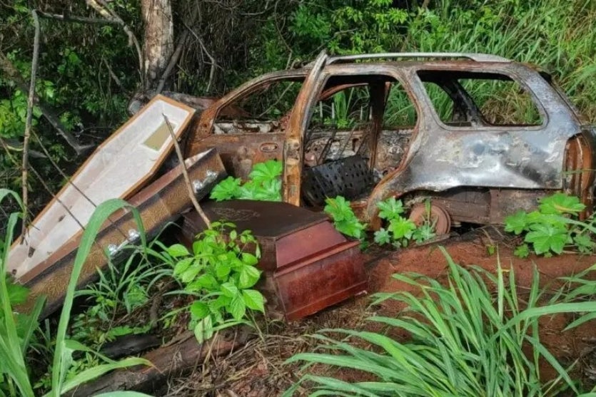Dois caixões foram encontrados abandonados às margens da rodovia PR-170, próximo ao Distrito de 7 de Maio, em Cambira, no Norte do Paraná, na manhã desta terça-feira (3). Os objetos estavam ao lado de um carro queimado, em uma área de mata, e foram descobertos por moradores do distrito, que se assustaram com a situação.