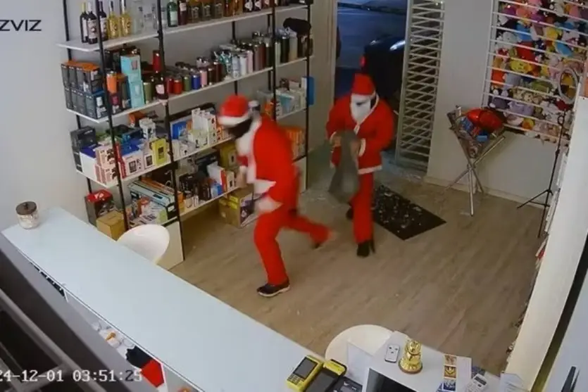 Dois homens vestidos de Papai Noel arrombaram e furtaram uma loja de eletrônicos na cidade de Cláudio, no centro-oeste de Minas Gerais, na madrugada do último domingo (1º). A ação foi registrada por câmeras de segurança.