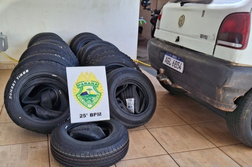 A Polícia Militar (PM) realizou a apreensão de um veículo VW/Gol e 95 pneus contrabandeados na tarde desta terça-feira (10). A situação aconteceu por volta das 14h40 em Guaiporã, distrito de Cafezal do Sul.