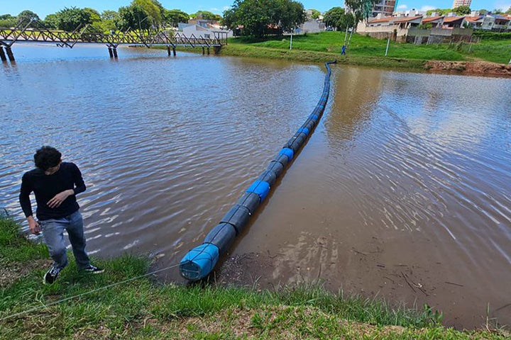 Lago Aratimbó passa por limpeza e ecobarreira para conter resíduos flutuantes é reinstalada