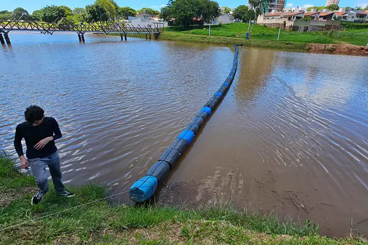 Por outro lado, a Secretaria Municipal do Meio Ambiente concluiu a recuperação da ecobarreira e reinstalou o dispositivo cruzando o lago de margem a margem, em um único ponto. A fixação foi reforçada com um cabo-guia de aço e redes de nylon envolvendo os galões que formam a ecobarreira, para evitar a dispersão em caso de outro rompimento.
