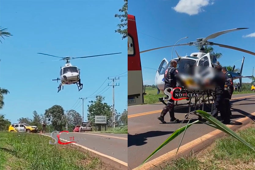Após os primeiros atendimentos na ambulância, a gravidade do caso exigiu a transferência aérea. O helicóptero pousou a cerca de 150 metros do local do acidente, permitindo que o motociclista fosse levado ao hospital em Maringá.