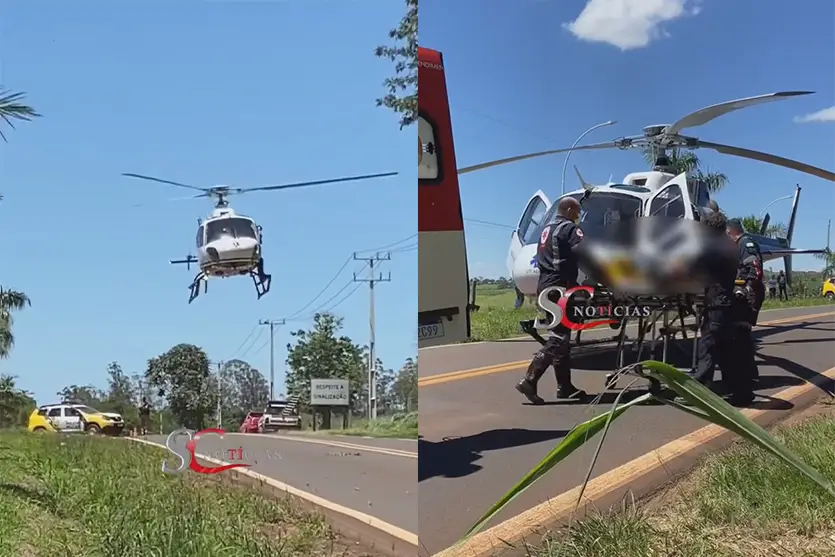 Após os primeiros atendimentos na ambulância, a gravidade do caso exigiu a transferência aérea. O helicóptero pousou a cerca de 150 metros do local do acidente, permitindo que o motociclista fosse levado ao hospital em Maringá.