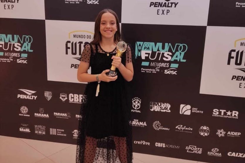 Maria Eduarda Godoi Pereira, de 11 anos, natural de Umuarama, foi uma das premiadas no ‘Gala Futsal Paraná 2024’, realizado no último dia 16 no Rafain Palace Hotel, em Foz do Iguaçu, oeste do Paraná. A cerimônia homenageou atletas e técnicos que se destacaram em competições ao longo do ano.