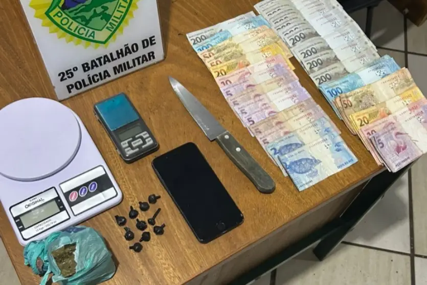No local, as autoridades apreenderam 143,9 gramas de maconha, 6,9 gramas de cocaína, além de R$ 8.314 em dinheiro, distribuídos por diversos pontos da residência. Também foram encontrados dois aparelhos de balança de precisão e uma faca. A substância encontrada na casa do suspeito estava acondicionada de forma semelhante àquela em posse do primeiro abordado, confirmando a prática de tráfico.