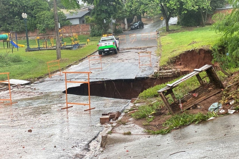 A ponte danificada pelas chuvas que caíram em Umuarama neste domingo (22) segue interditada. Localizada na Rua dos Lírios, a estrutura conecta os bairros Laranjeiras e Porto Belo e foi comprometida após uma erosão provocada pelo grande volume de chuva.