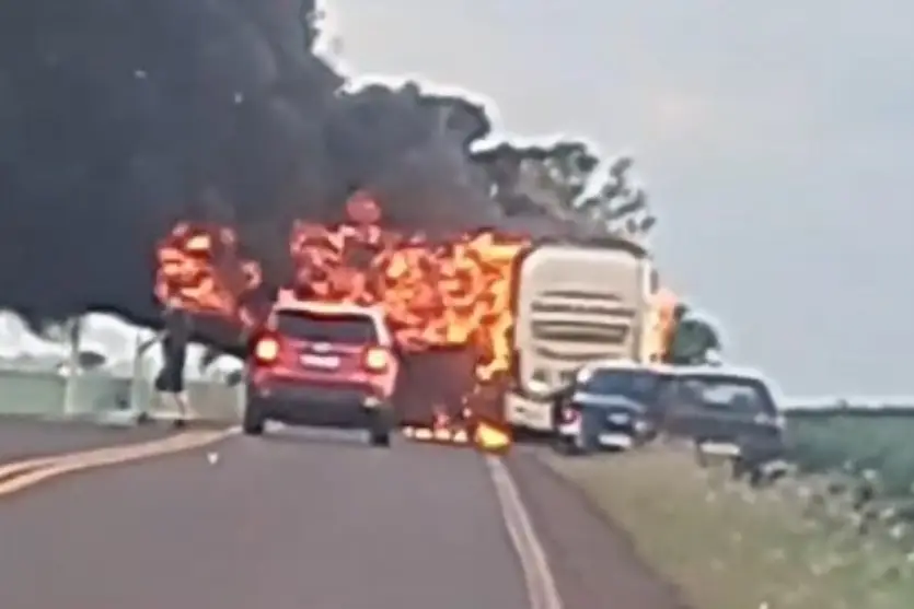 Um incêndio consumiu um ônibus na PR-364, no trecho entre Terra Roxa e Palotina, na noite desta quarta-feira (25). O incidente foi registrado por volta das 18h45 no km 596+500 da rodovia e o condutor, de 46 anos, felizmente conseguiu sair do veículo sem ferimentos.