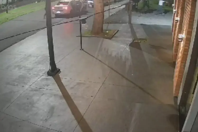 Logo depois, o motorista também sai do carro e se junta ao grupo. Menos de um minuto após a chegada, os suspeitos retornam ao veículo em alta velocidade, enquanto um dos jovens é visto fugindo ao fundo das imagens. O carro dos vigilantes deixa o local rapidamente.