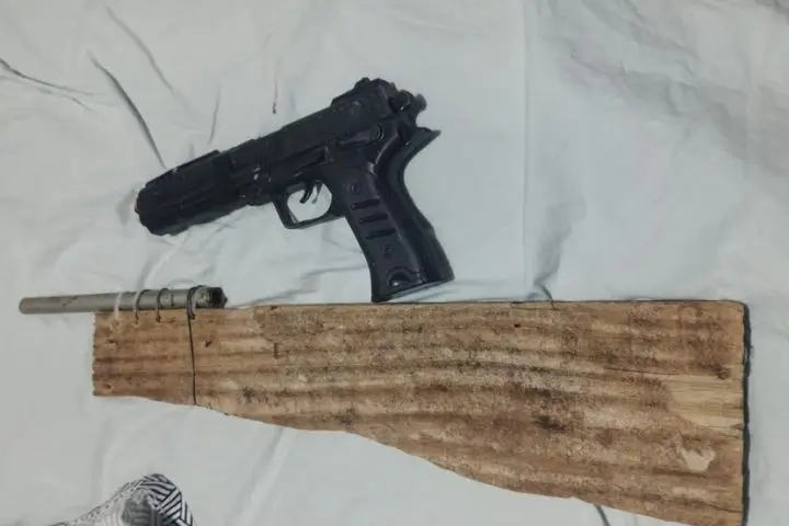 A equipe policial foi até a residência do suspeito e realizou uma abordagem inicial, mas nada ilícito foi encontrado com ele. Contudo, durante uma busca no interior da casa, os agentes localizaram um simulacro de arma de fogo, tipo pistola, e um pedaço de madeira, os quais teriam sido utilizados para intimidar as vítimas.
