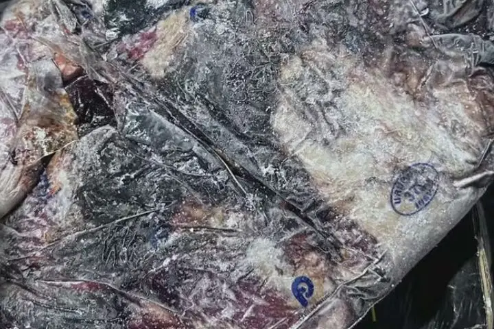 Carne estragada das enchentes Do Rio Grande do Sul que foram revendidas a clientes de supermercado como produto nobre, importado (FOTO: REPRODUÇÃO TV GLOBO)