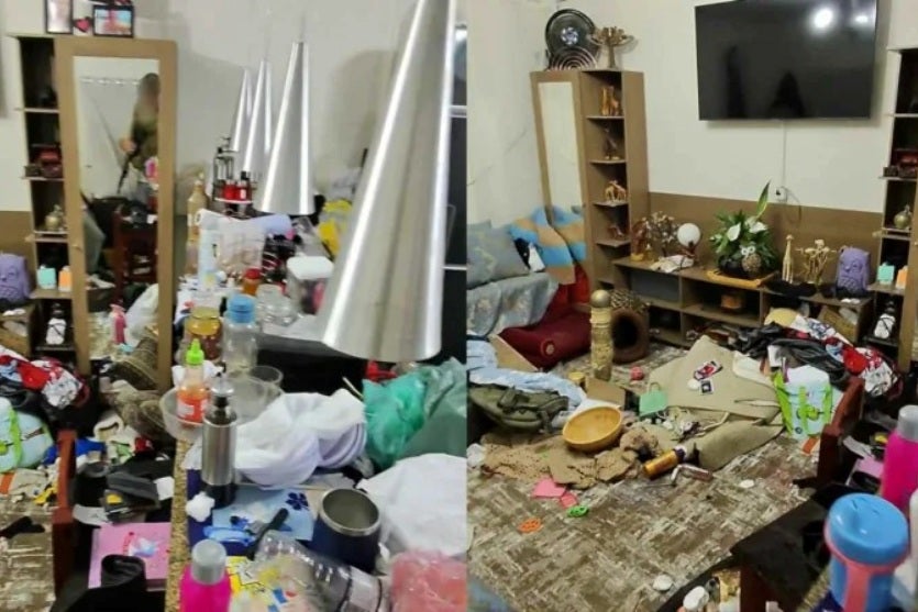 As gravações mostram o espaço extremamente desorganizado. Há diversos itens amontoados e espalhados pelo chão, incluindo cartas, potes, sacolas, itens de decoração, bolsas e outros produtos.