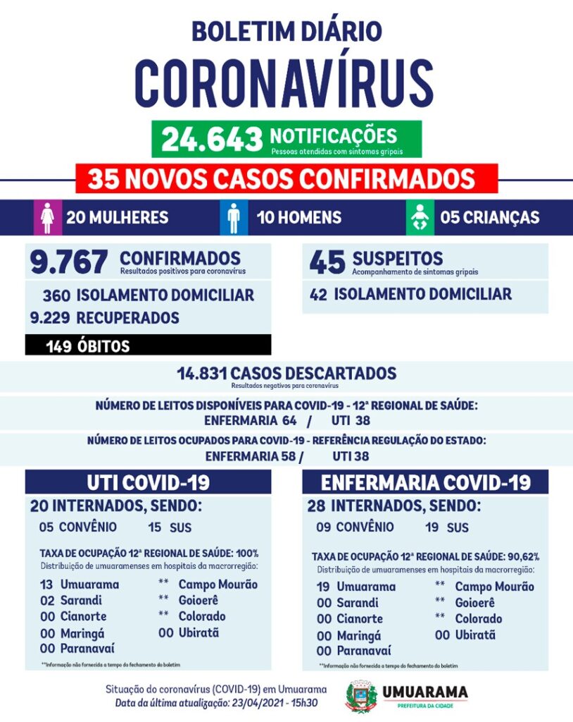 Agora o total de umuaramenses mortos por causa da Covid-19 chegou a 149 desde o início da pandemia. Nas Unidades de Terapia Intensiva (UTIs) a lotação é de 100% (todos os 38 leitos) e nas enfermarias passa de 90%, com 58 dos 64 leitos ocupados, conforme a Prefeitura.
