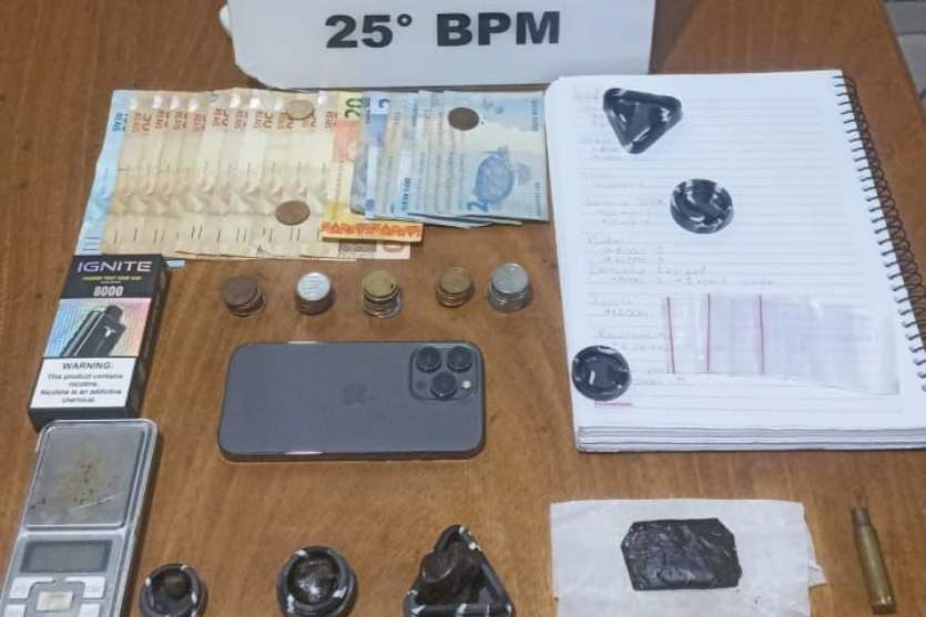 Durante a revista, os policiais encontraram quatro porções de haxixe avaliadas em R$ 1.300, além de um cigarro eletrônico. Em seguida, as equipes revistaram a residência do suspeito e apreenderam R$ 645 em dinheiro, uma balança de precisão, uma cápsula de munição, um caderno com anotações e um aparelho celular.
