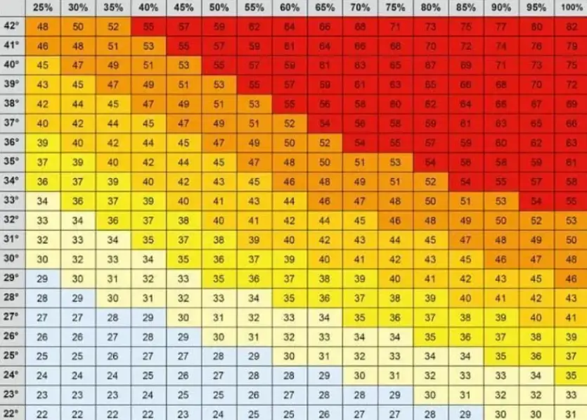 A sensação térmica é calculada a partir da combinação da temperatura em graus Celsius e da umidade relativa do ar, medida em porcentagem. Por exemplo, em uma cidade onde os termômetros marcam 38 °C e a umidade do ar é de 60%, a sensação térmica pode chegar a 55 °C. Já em outra localidade, com previsão de 41 °C e umidade de 40%, a sensação pode ser de 53 °C.