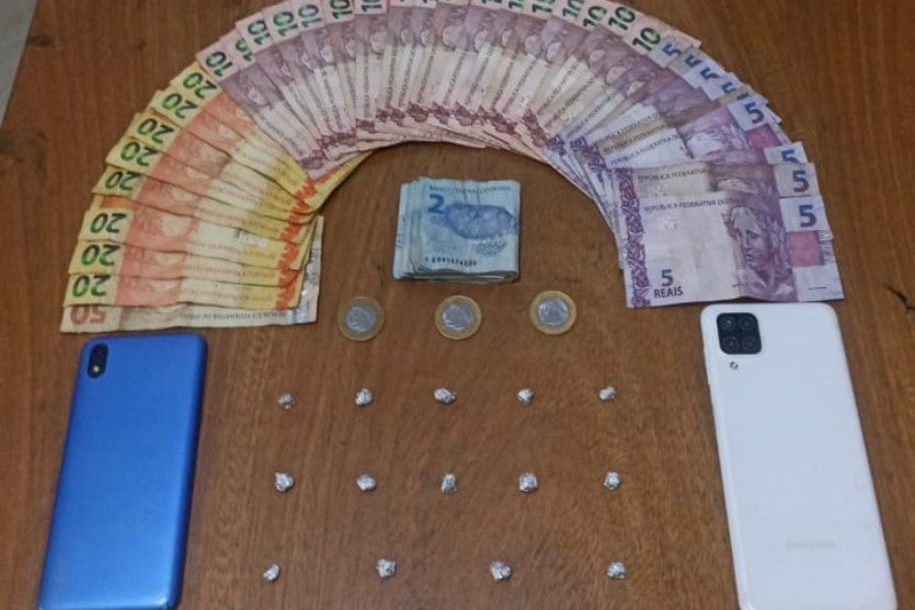 Durante buscas no local, os agentes apreenderam R$ 454 em dinheiro trocado, dois aparelhos celulares e 14 porções de crack, totalizando aproximadamente 2 gramas da substância. Os materiais estavam embalados e prontos para comercialização.