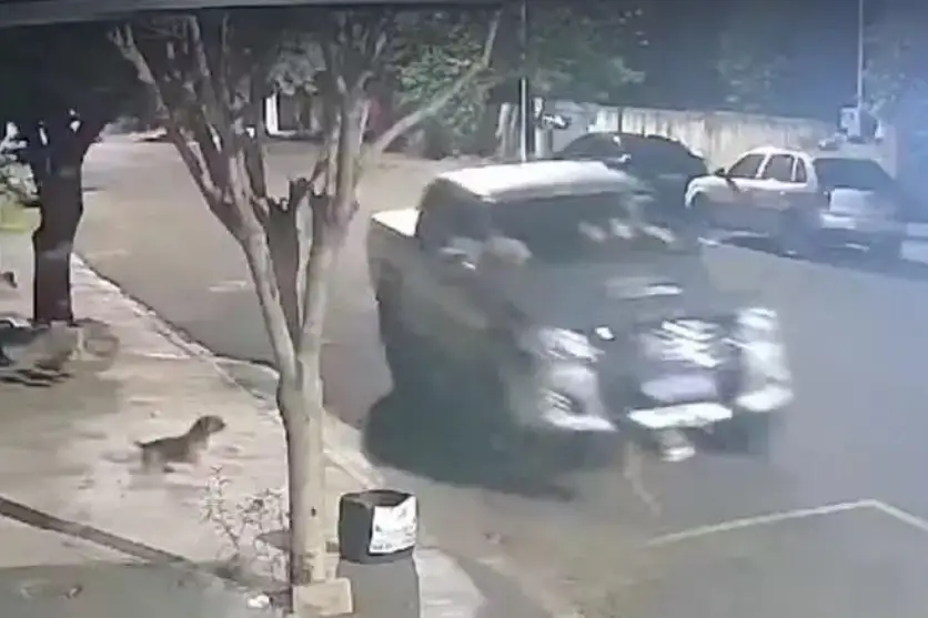 Um cachorro morreu atropelado na madrugada de terça-feira (4) em Porto Rico. Câmeras de segurança registraram o momento em que um suspeito em uma caminhonete atropela o cachorro de propósito na Rua Pioneiro João Mangialardo, por volta das 3h20.