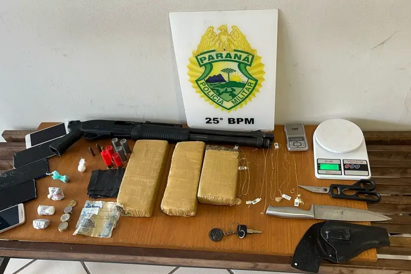 No imóvel, onde o jovem foi preso, foram localizados uma balança de precisão, três tabletes e quatro porções de maconha, uma porção de cocaína de 5 gramas, embalagens para acondicionamento de entorpecentes, além de munições de calibres .38 e 12. Também foram encontrados quatro aparelhos celulares e oito colares, que foram reconhecidos por uma ótica da cidade como produtos de furto.