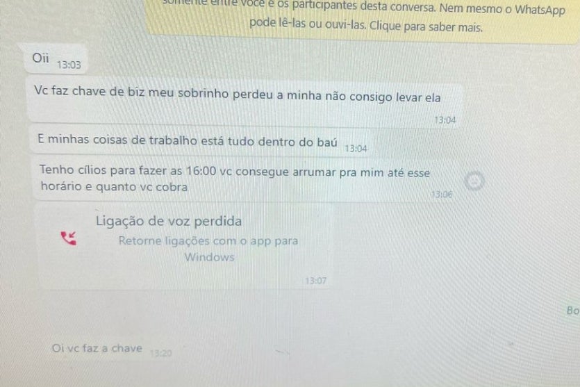 De acordo com os trabalhadores, por volta das 13h eles receberam um chamado de uma pessoa que se passou por uma cliente. Essa pessoa informou que um sobrinho teria perdido a chave de uma Biz 2023 branca, de banco caramelo, e precisava de alguém para destravá-la e fazer uma nova chave.