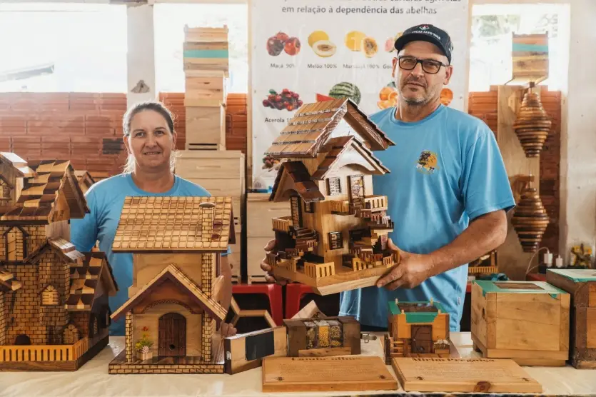Os empresários Rosi e Osmar Zanotti, que divulgam a criação de abelhas sem ferrão - Fotos: Igor Gobbo/Assessoria Expo Umuarama