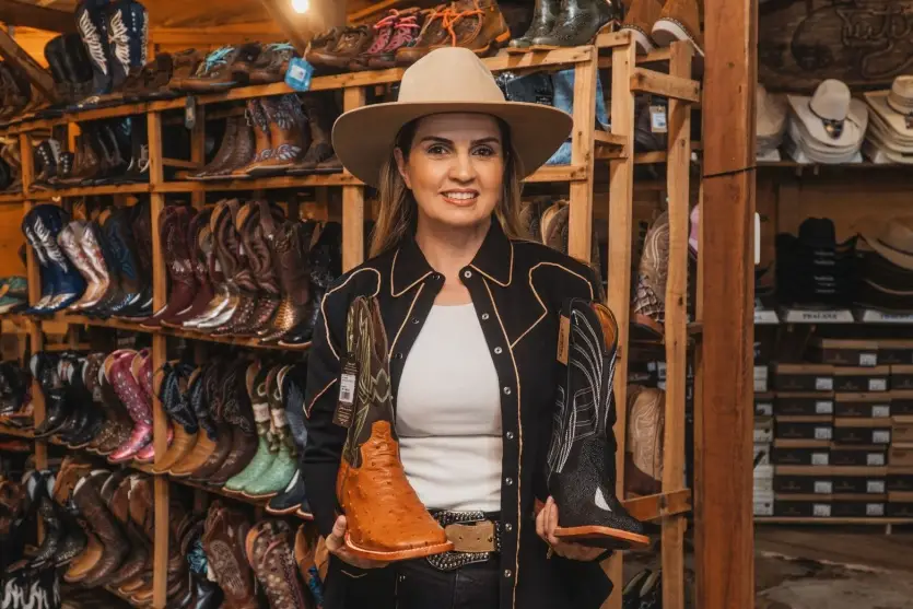 Roberta Cordeiro, proprietária da Tuti, destaca a variedade de produtos, incluindo botas de couro de jacaré, pirarucu, avestruz, elefante e arraia, além de mochilas especiais para carregar laços e selas. A loja também se distingue pelos produtos importados do Texas, considerados verdadeiras declarações de estilo.