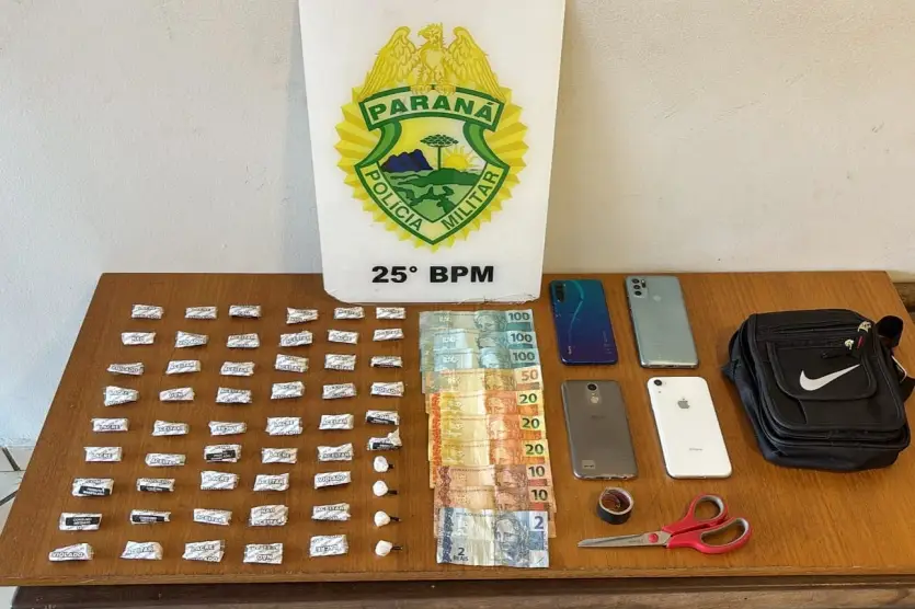 O 25º Batalhão da PM apreendeu 4 celulares; R$ 432 em espécie; cerca de 112 gramas de cocaína divididas em 51 porções com lacre e mais 4 em buchas, além de uma tesoura.
