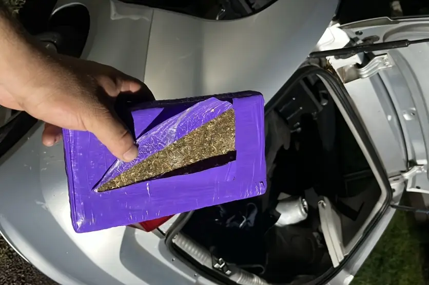 Durante o patrulhamento, policiais da Rádio Patrulha notaram um carro em atitude suspeita e realizaram a abordagem. O condutor era menor de idade e, ao revistar o veículo, a equipe encontrou um compartimento preparado para o transporte de ilícitos. Dentro dele, havia um tablete de maconha pesando 884 gramas.