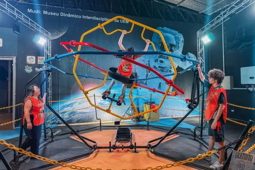Uma das experiências que mais chamam a atenção no espaço do Mudi é o Giroscópio Humano, equipamento que simula a sensação de gravidade zero e faz parte do treinamento de astronautas. Com ele, estudantes e a comunidade em geral experimentam um pouco da sensação de estar no espaço.