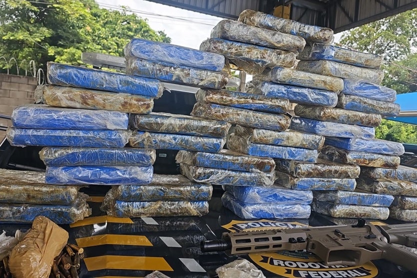 A atitude suspeita gerou uma inspeção mais detalhada no veículo. Os agentes localizaram compartimentos ocultos no assoalho e no encosto do banco traseiro. Dentro desses espaços, foram encontrados 54,53 kg de pasta base de cocaína, divididos em 50 tabletes, e 100 gramas de haxixe. Além disso, as autoridades descobriram um fuzil Colt calibre .556, uma pistola Bersa calibre .380 e 375 munições para fuzil, além de 20 munições para pistola.