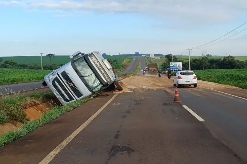 O caminhão também estava carregado com areia e parte da carga ficou despejada na via. As equipes trabalharam para fazer a remoção do veículo e da carga e o trecho ficou interditado durante os trabalhos.