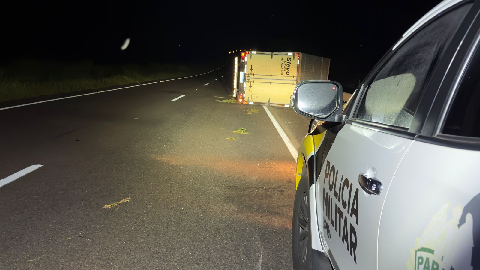 Motorista perde controle de carreta e veículo tomba na rodovia PR-323