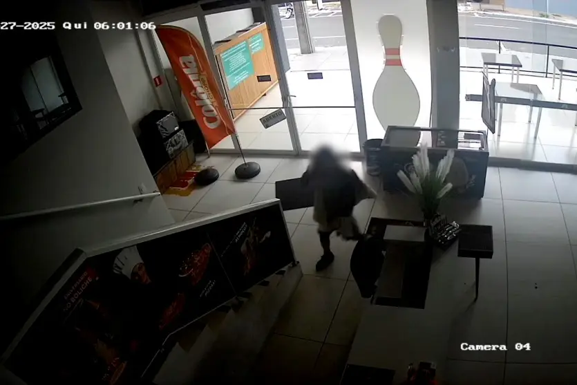 Imagens de câmeras de segurança registraram um furto em uma pizzaria e boliche no centro de Umuarama, na madrugada desta quinta-feira (27). O crime ocorreu por volta das 5h50, na Rua Ministro Oliveira Salazar.