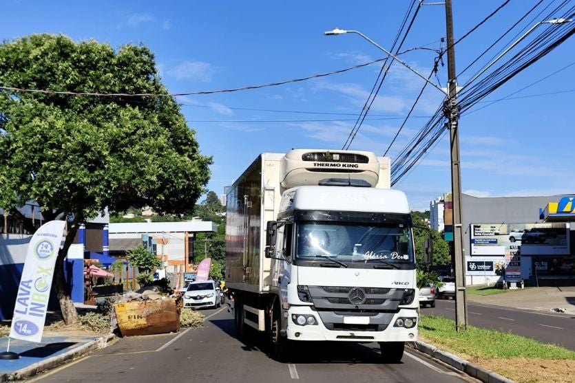 Um caminhão carregado com frios paralisa o trânsito na avenida Paraná, sentido centro-bairro, na manhã desta sexta-feira (4) em Umuarama.