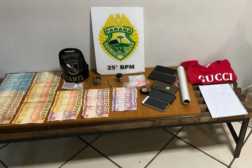 Em seguida, os policiais se deslocaram até a residência do suspeito, onde a situação de tráfico foi confirmada. Utilizando um cão de faro, os agentes localizaram três porções de cocaína e R$ 2.185,00 em dinheiro. Além disso, foram apreendidos cinco celulares, um caderno com anotações relacionadas ao tráfico e diversas embalagens vazias, usadas para acondicionar as drogas.