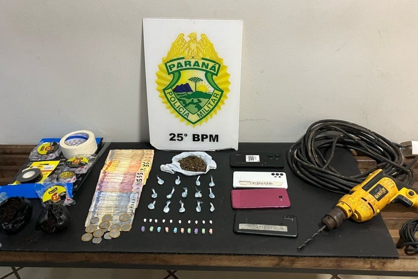 As equipes seguiram até a residência e encontraram no interior do imóvel 12 porções de cocaína já embaladas, R$ 242 em dinheiro, dois aparelhos celulares, uma furadeira possivelmente furtada e materiais comumente utilizados para o preparo e a embalagem de drogas, como sacos plásticos e fita adesiva.
