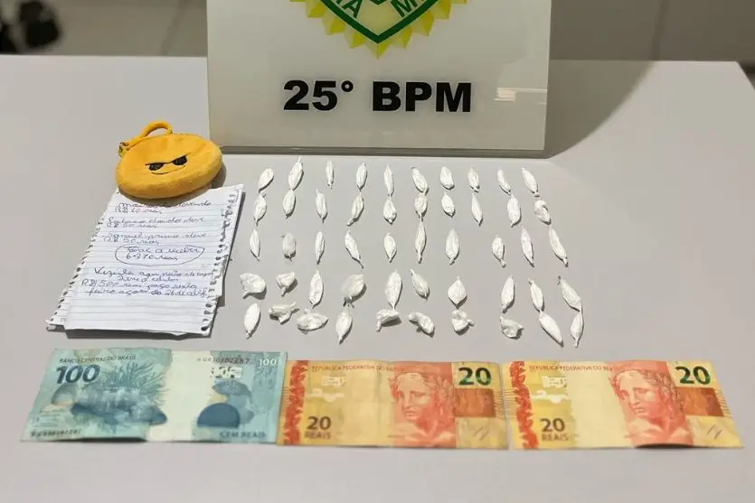 Na revista pessoal, os policiais localizaram oito embalagens plásticas contendo aproximadamente 10 gramas de uma substância análoga à cocaína, além de R$ 140 em espécie, comprovantes de depósitos bancários e anotações que indicam possível atividade de venda de drogas.