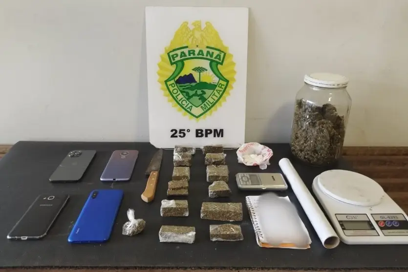 No local, foram apreendidos 610 gramas de maconha e 17 gramas de cocaína, além de outros itens usados para o comércio de entorpecentes. Entre os objetos encontrados estavam duas balanças de precisão, uma faca, um rolo de papel filme (utilizado para embalar as drogas) e uma caderneta com anotações que indicam a prática de tráfico.