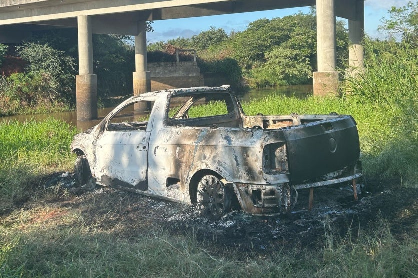 Enquanto isso, as equipes policiais realizaram buscas na região e localizaram o VW/Saveiro incendiado próximo à margem do rio. O veículo foi encontrado completamente destruído pelas chamas. O local foi isolado, e o automóvel foi removido para a Delegacia da Polícia Civil para perícia.