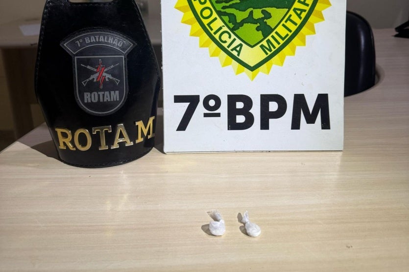 Com sinais sonoros e luminosos, os policiais ordenaram que o grupo parasse. A ordem foi acatada imediatamente pelos três. Durante a busca pessoal, os agentes encontraram duas buchas de substância análoga à cocaína. O entorpecente estava embalado em plástico transparente e escondido no bolso frontal de uma blusa de moletom usada por um dos abordados.